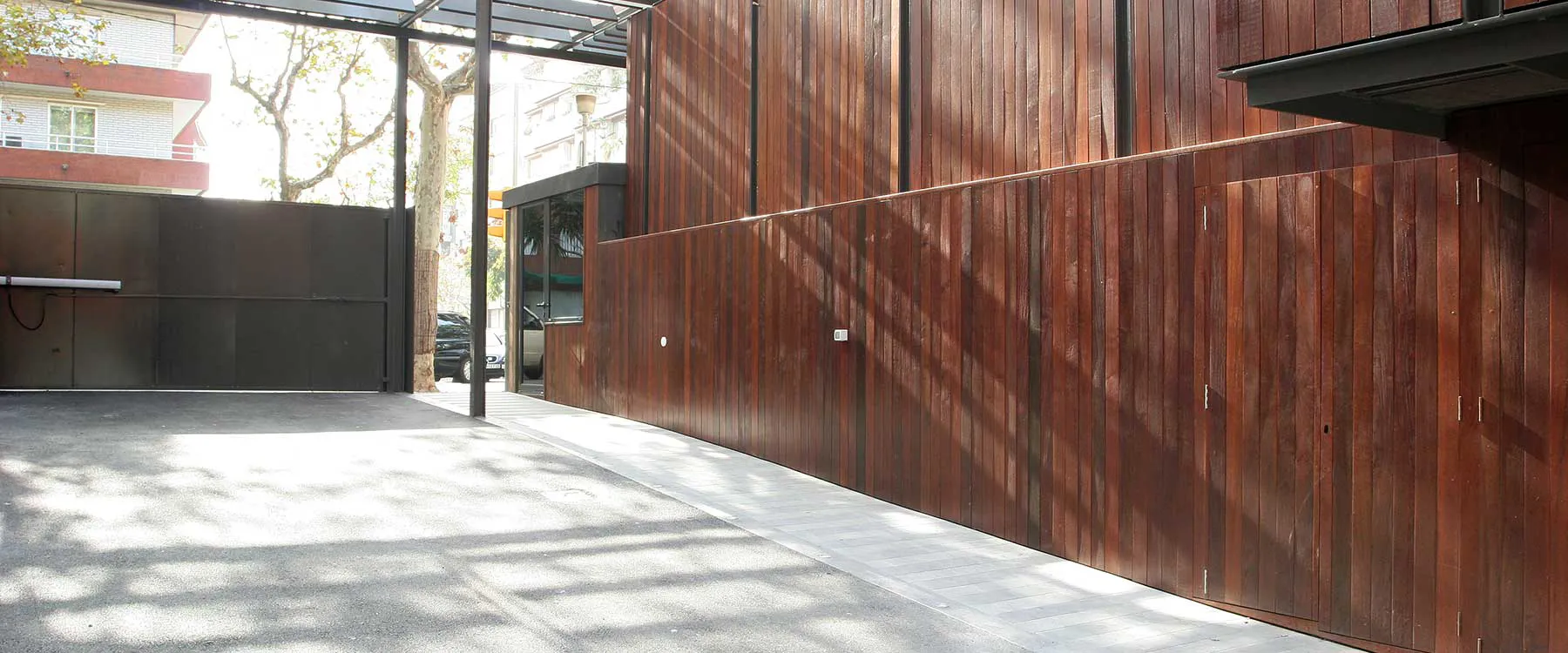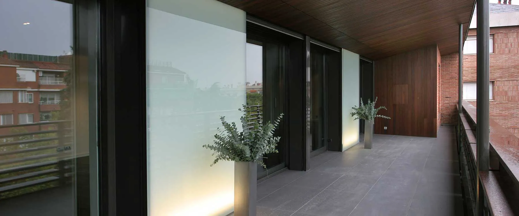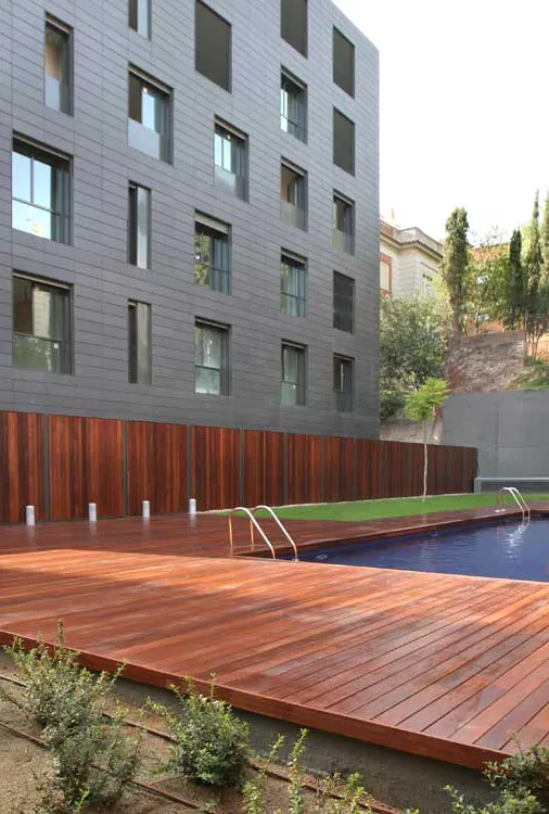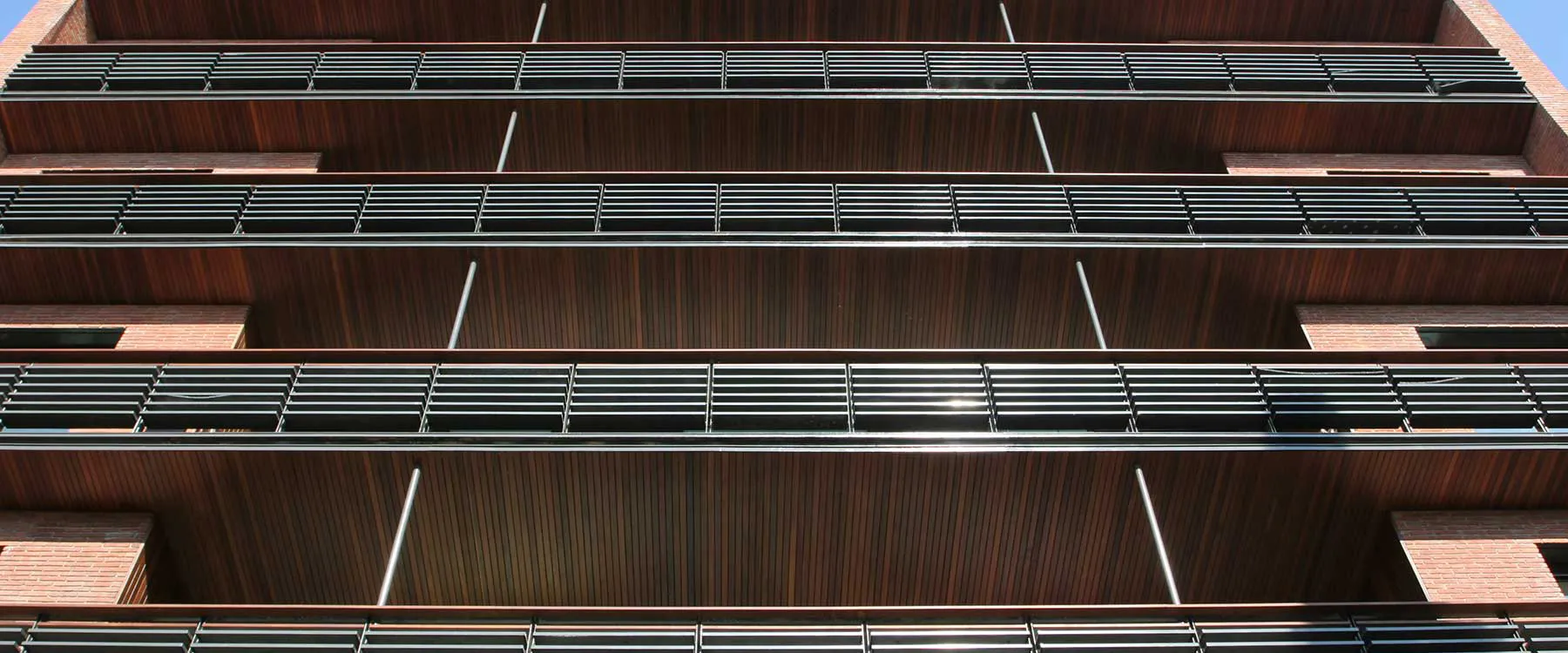 A la façana, els sostres dels balcons i els revestiments en fusta laminada aporten una imatge càlida i elegant que es diferencia, però alhora s’integra, amb l’entorn urbà. El tractament de la fusta per a l’exterior ha estat clau per garantir durabilitat i resistència, sense renunciar a l’estètica.