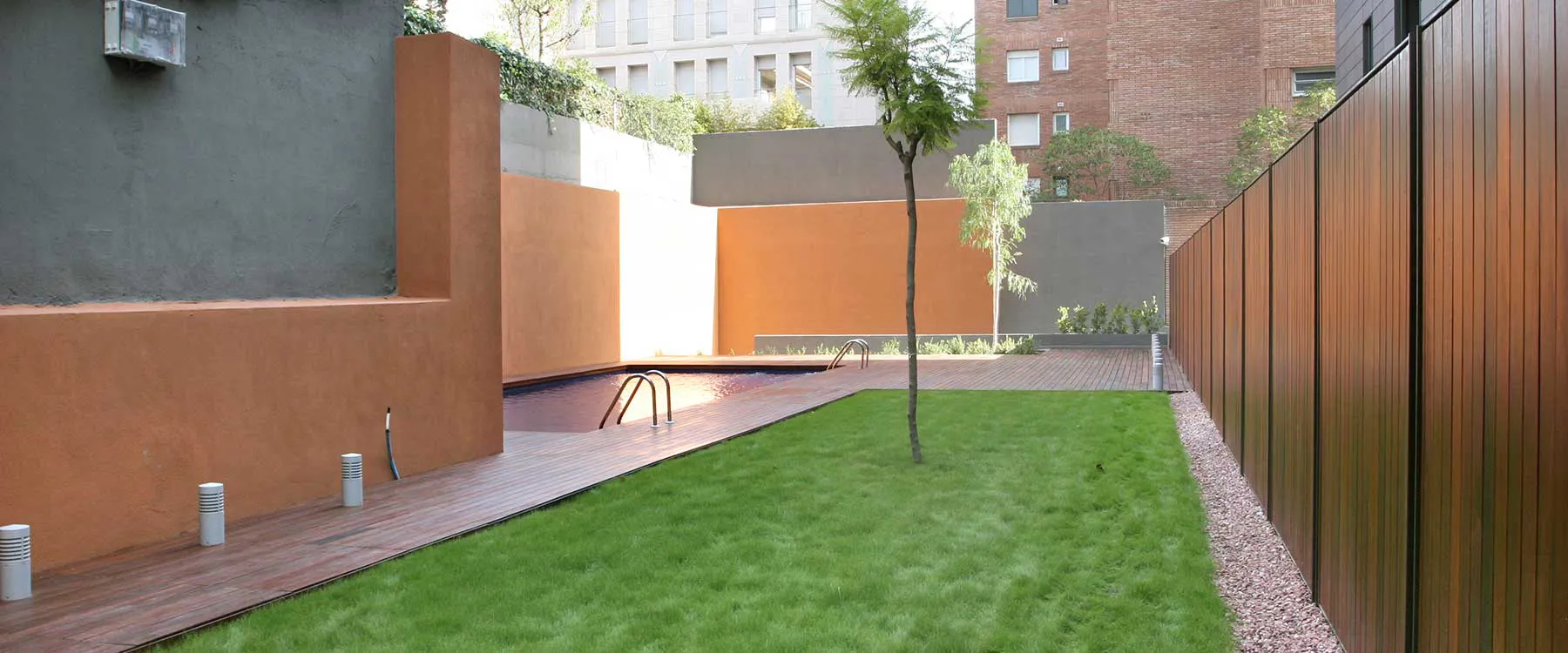 A l’interior dels habitatges, els terres en fusta ofereixen continuïtat visual i una sensació de confort i naturalitat que defineix l’ambient general. A l’espai exterior, la zona de piscina esdevé un petit refugi gràcies a l’ús del mateix material: el terra i el tancat perimetral en fusta creen una atmosfera relaxada i cohesionada amb la resta del projecte.