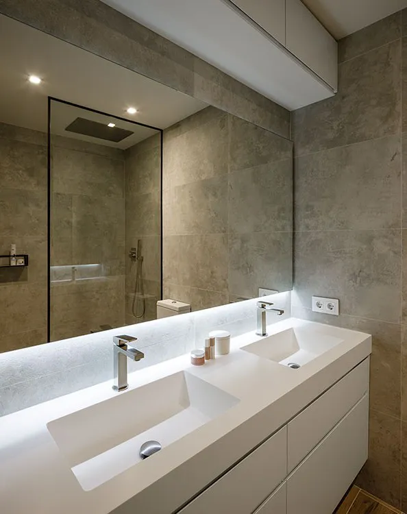 A l’interior, hem realitzat treballs de fusteria al bany, cuina, menjador i dormitoris, amb armaris encastats dissenyats a mida per optimitzar l’espai i aportar continuïtat als acabats. També hem intervingut a l’escala i l’estudi, buscant una integració harmònica de materials i funcionalitat.