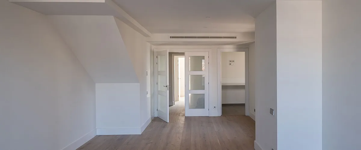 Als pisos, s’han instal·lat nous paviments de parquet que aporten calidesa i continuïtat visual. També s’han dissenyat i col·locat armaris a mida, optimitzant l’emmagatzematge i adaptant-se a les necessitats dels usuaris. Les portes interiors han estat renovades, amb un acabat net i funcional que contribueix a la sensació d’ordre i lluminositat.