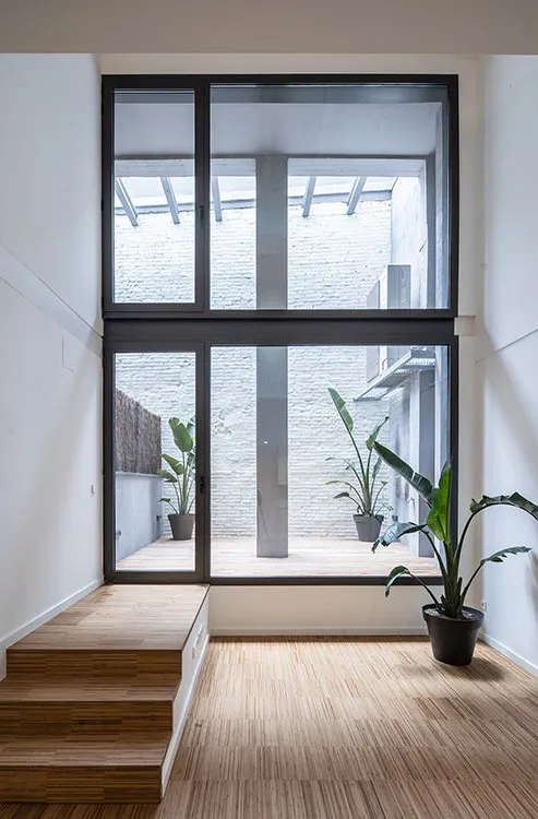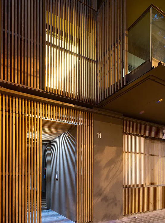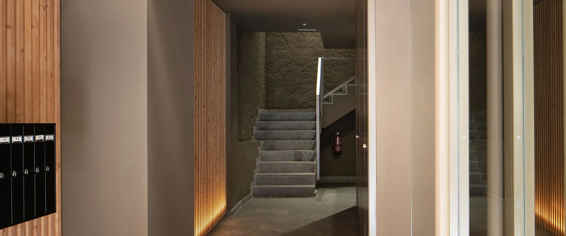A l’exterior, la façana s’ha renovat amb elements en fusta que aporten caràcter i integració amb l’entorn urbà. A l’interior, el rebedor i l’escala s’han revestit amb panells de fusta que transformen completament l’experiència d’entrada a l’edifici, aportant una sensació càlida i acollidora des del primer moment.