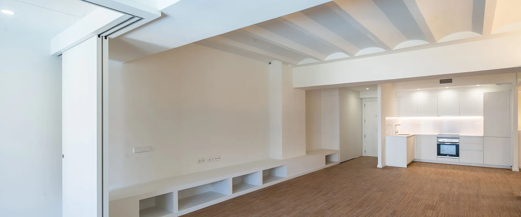 Als habitatges, cada detall ha estat cuidat: terres, portes, mobiliari i elements de cuina i bany han estat fets a mida per optimitzar l’espai i mantenir una coherència estètica. També hem treballat els espais exteriors dels terrats, revestint-los amb fusta per convertir-los en zones agradables i funcionals.